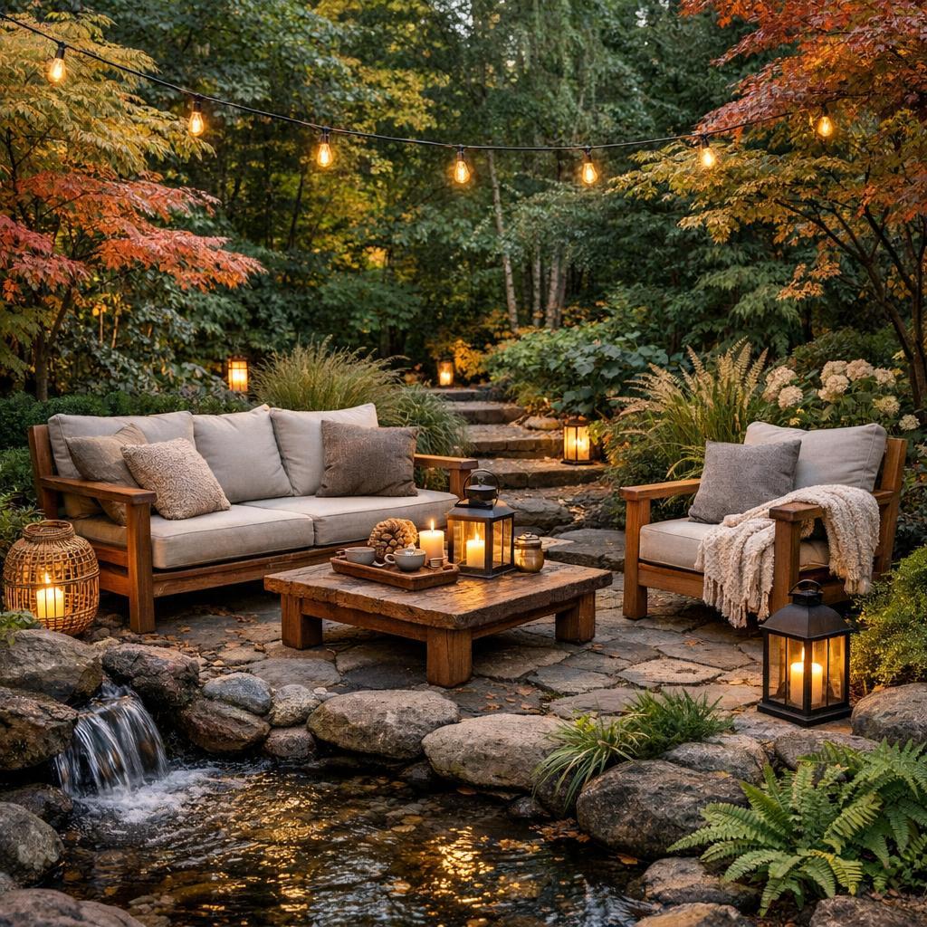 Gemütliche Sitzplätze mit wärmenden Decken und Laternen laden zu entspannten Stunden ein. Feuerstellen oder Heizstrahler verlängern die Nutzung des Gartens in die kühleren Monate.